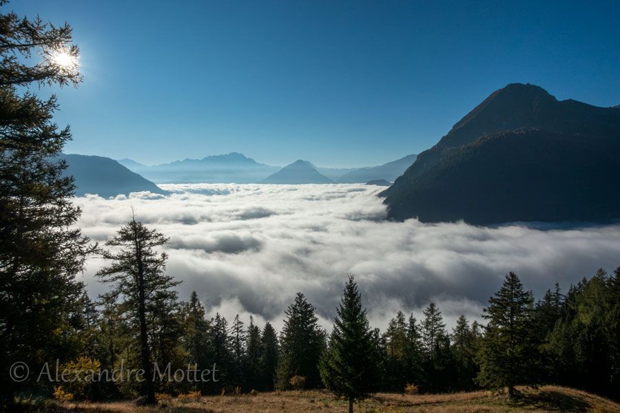 Les rayons du soleil plongent sur les Alpes Vaudoises, vue depuis la Valerette